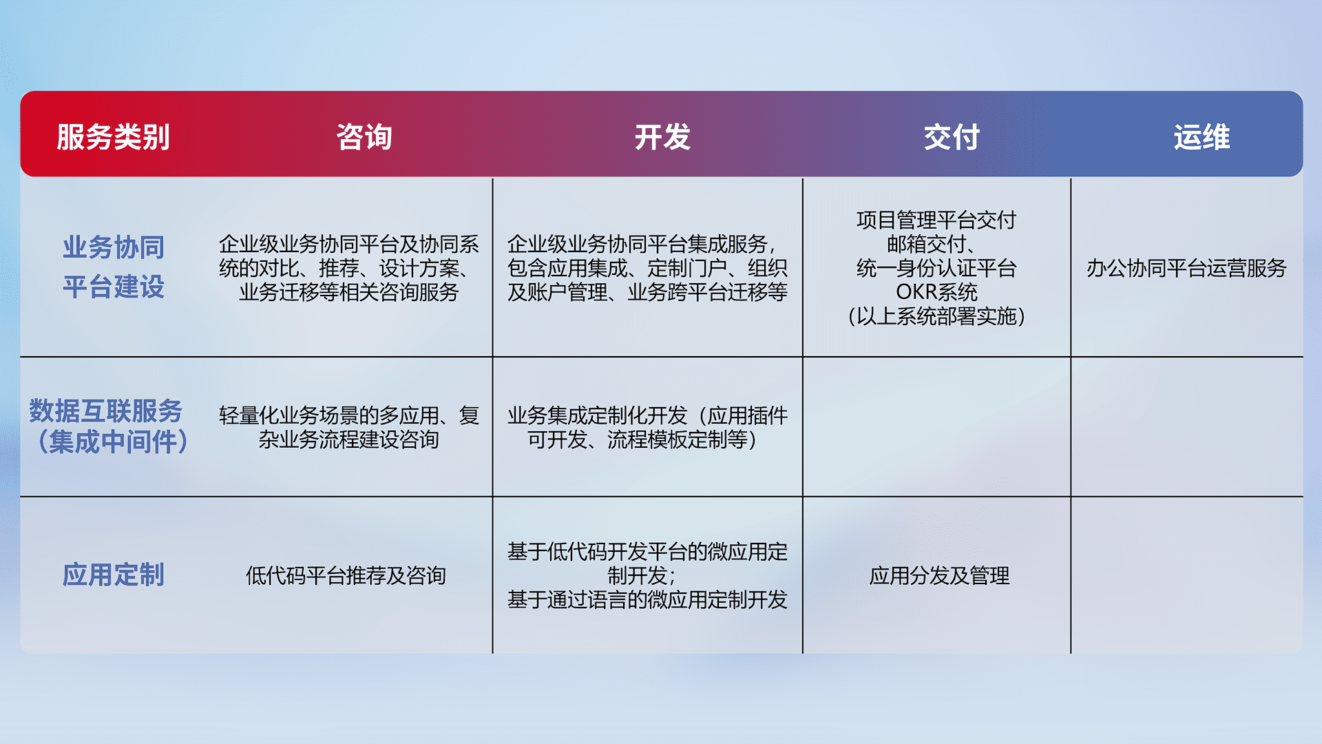 针对钉钉、、企微、、IDaas等平台级产品提供产品的规划、、、方案、、交付、、、、定制化开发等服务,,实现如统一协同办公、、、智能客户服务、、、、混合会议管理、、、智能数据查询、、等业务场景,,实现数字化转型。。。。